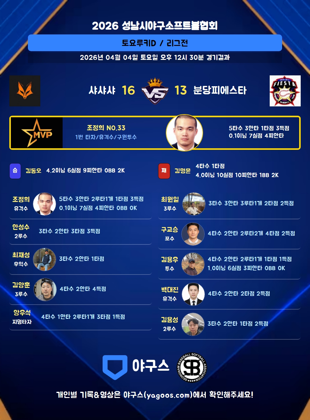 | 1 | 김명윤(55) | 패 | 4.0 | 26 | 22 | 10 | - | 3 | 2 | 73 | 10 | 6 | 13.50 |