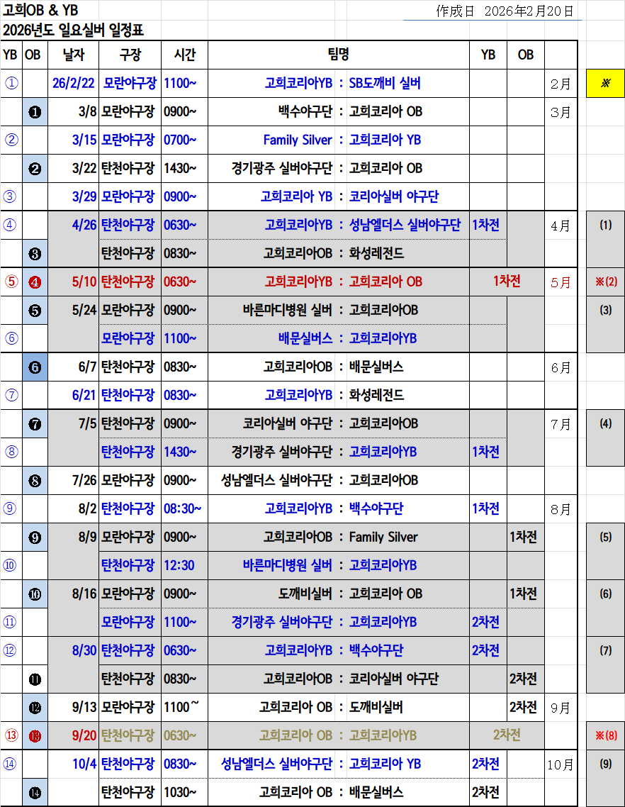 OB & YB 경기일정표(26.2.20현재)