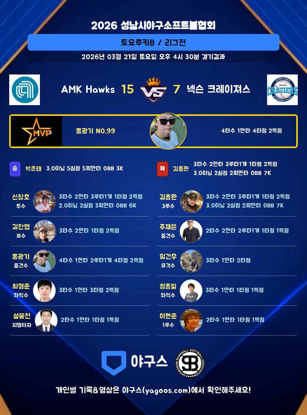 | 3 | 중 | 홍광기(99) | 3땅(1타점) | - | 삼진 | 좌월2(3타점) | 유땅출 | - | 4 | 1 | 4 | 2 | - | 1 | - | 1 | 0.250 |